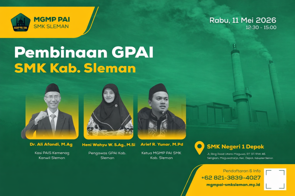 Sleman — Musyawarah Guru Mata Pelajaran (MGMP) Pendidikan Agama Islam (PAI) SMK Kabupaten Sleman menyelenggarakan kegiatan Pembinaan Guru Pendidikan Agama Islam (GPAI) pada Rabu, 11 Mei 2026, bertempat di SMK Negeri 1 Depok. Kegiatan ini diikuti oleh guru-guru PAI SMK se-Kabupaten Sleman sebagai upaya penguatan profesionalisme, pembinaan spiritual, serta koordinasi program pembelajaran dan administrasi keagamaan.